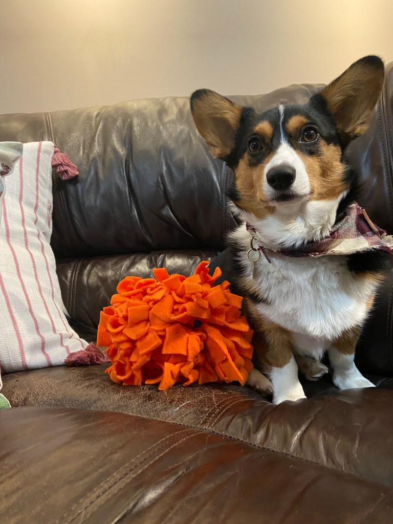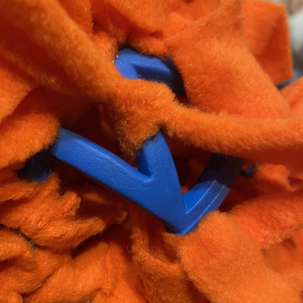 One of my favourite options is a snuffle ball, which is a soft treat dispensing toy. Luckily for everyone, these are easy to make at home with minimal supplies! There are a few different types of snuffle balls, my favourite involves strips of fleece and a rubber ball with holes, such as the JW HOL-ee Roller Ball.