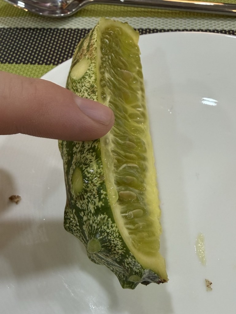 Someone asked for more food pictures, in Zanzibar we cooked at our hotel a lot and so far meals have been family style or buffet so they don’t look great. I did have a new to me fruit today, a thorn melon. It has a thick skin (the thorns were removed) with a green flesh that is similar consistency to an orange and seeds like a cucumber. It had a very mild flavour similar to a citrusy cucumber.