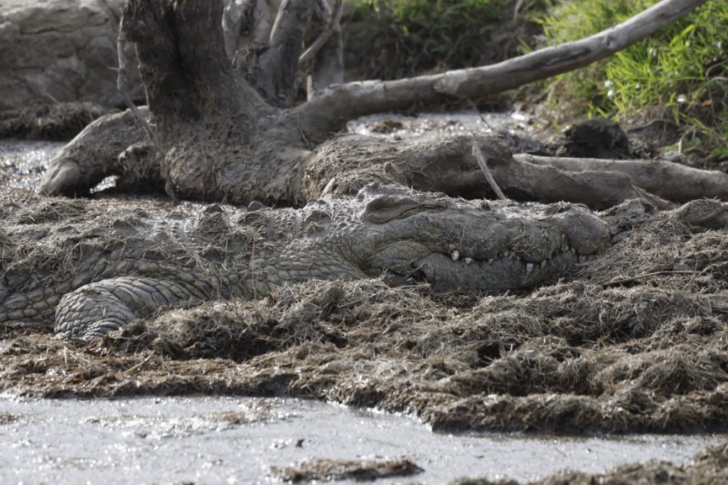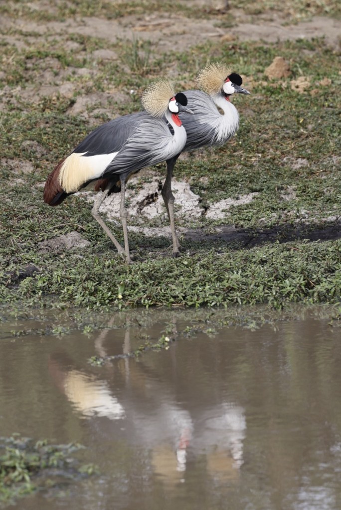 We continued driving and I finally saw a large crocodile! In the same area we saw a few vervet monkeys along the river on top of floating vegetation. This was a behaviour we had not seen yet on this trip. At one point a monkey got too close to a pair of Egyptian geese, who honked and chased the monkey away from the river. There was also a pair of grey crowned cranes on the river bank who posed fabulously for us.