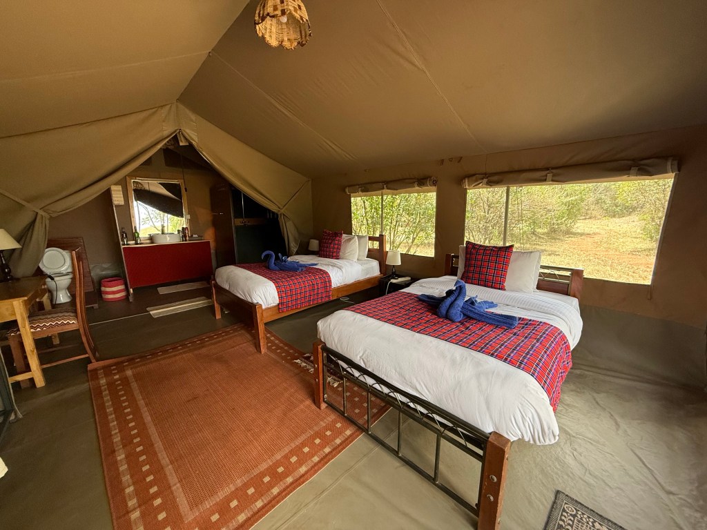 Our first camp after flying out of Nairobi was in the Masai Mara. Tembo by Jackson Bush Camp is located a shady forested area that is frequently visited by wildlife. The tents were spacious and far enough apart you never heard your neighbours. We didn’t have any close encounters, but one couple in our group opened their tent flaps to an elephant right outside the steps! Our group were the only ones in the camp, so we had all of the common areas to ourselves. The owner of this camp, Jackson, is also a photographer, so his knowledge of where to go and how to position the vehicle was definitely a bonus. There was a small shop filled with locally made items. If anyone goes to this camp, get your shopping in! Items at this shop were significantly cheaper than other camps and also cheaper than Nairobi.